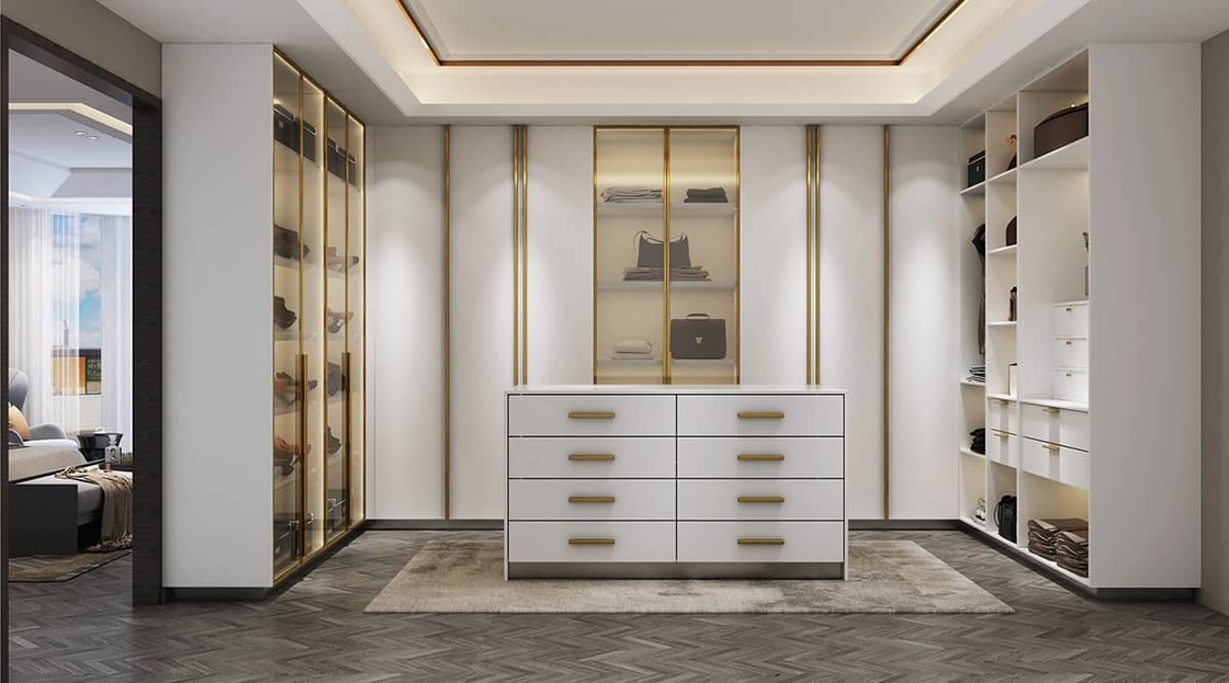 | Product Name | White-Gold Stainless Steel Wardrobe - Luxury Glass Shelves & Drawers |