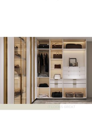 Inside, experience intelligent organization with ultra-clear tempered glass shelves and smooth-gliding drawers that showcase your wardrobe essentials like fine display pieces. The transparent shelves create an airy, open feel while offering sturdy support for folded garments, handbags, or accessories. Each drawer glides silently on premium runners, ensuring effortless access and quiet operation — perfect for early mornings or late nights. Thoughtful spacing and adjustable configurations let you customize layouts to fit everything from cashmere sweaters to designer shoes.