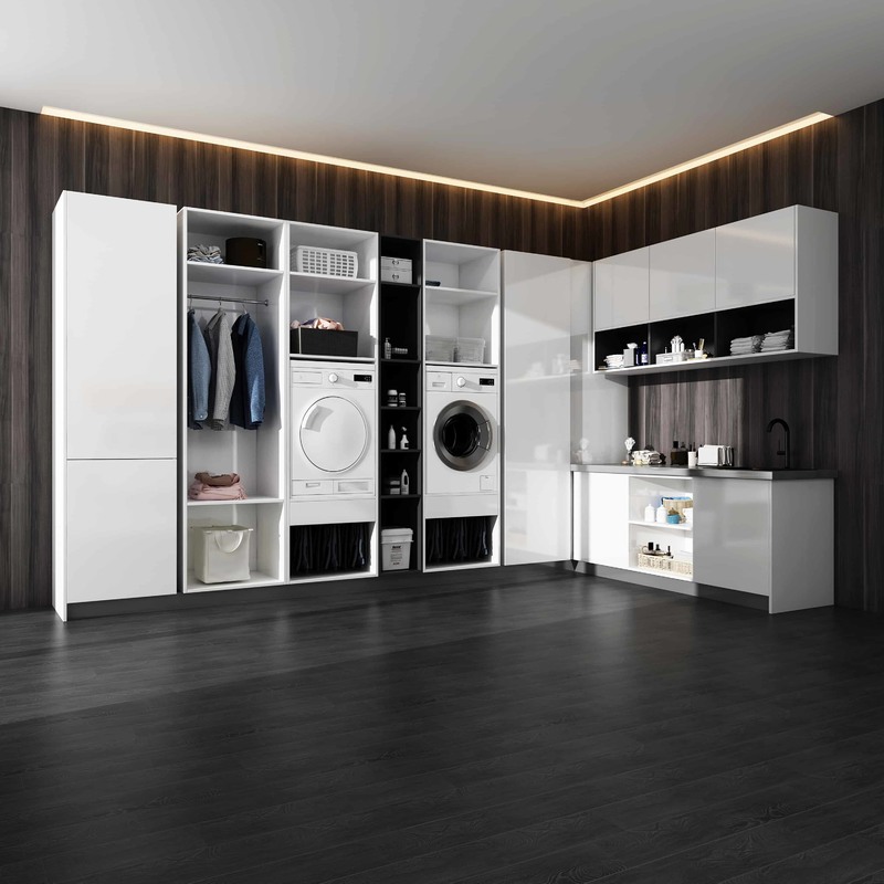 ออกแบบมาเพื่อการจัดระเบียบในครัวเรือนอัจฉริยะ ตู้นี้มีชั้นวางแบบปรับได้ ช่องที่ซ่อนอยู่ และลิ้นชักเลื่อนได้อย่างราบรื่นเพื่อเพิ่มพื้นที่ในแนวตั้งโดยไม่เกะกะ การออกแบบแบบแยกส่วนรองรับผงซักฟอก อุปกรณ์ทำความสะอาด ผ้าปูที่นอน และแม้แต่เครื่องใช้ไฟฟ้าขนาดเล็ก เปลี่ยนโซนซักผ้าที่วุ่นวายให้กลายเป็นพื้นที่ที่มีประสิทธิภาพและใช้งานได้จริง รายละเอียดที่พิถีพิถัน เช่น บานพับปิดแบบนุ่มนวล ขอบนิรภัยแบบโค้งมน และซีลกันความชื้น ช่วยให้การทำงานเงียบและเป็นมิตรกับเด็กในพื้นที่ครอบครัวที่มีการจราจรหนาแน่น