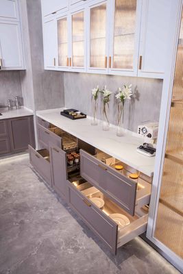 เพื่อเพิ่มความอเนกประสงค์ ตัวเลือกที่เก็บแก้วของเราจึงเป็นวิธีที่มีสไตล์ในการจัดวางจานชามหรือของตกแต่งที่คุณชื่นชอบ ประตูกระจกนิรภัยกรอบด้วยทองเหลือง ให้ทั้งทัศนวิสัยและการปกป้อง ไม่ว่าจะใช้สำหรับตู้หรือชั้นวางแบบเปิด การผสมผสานระหว่างสีเทา แก้ว และทองเหลืองนี้สร้างบรรยากาศที่หรูหราแต่น่าดึงดูดใจ ยกระดับห้องครัวของคุณด้วยการผสมผสานที่ลงตัวระหว่างความสวยงามสมัยใหม่และอุปกรณ์จัดเก็บที่ใช้งานได้จริง